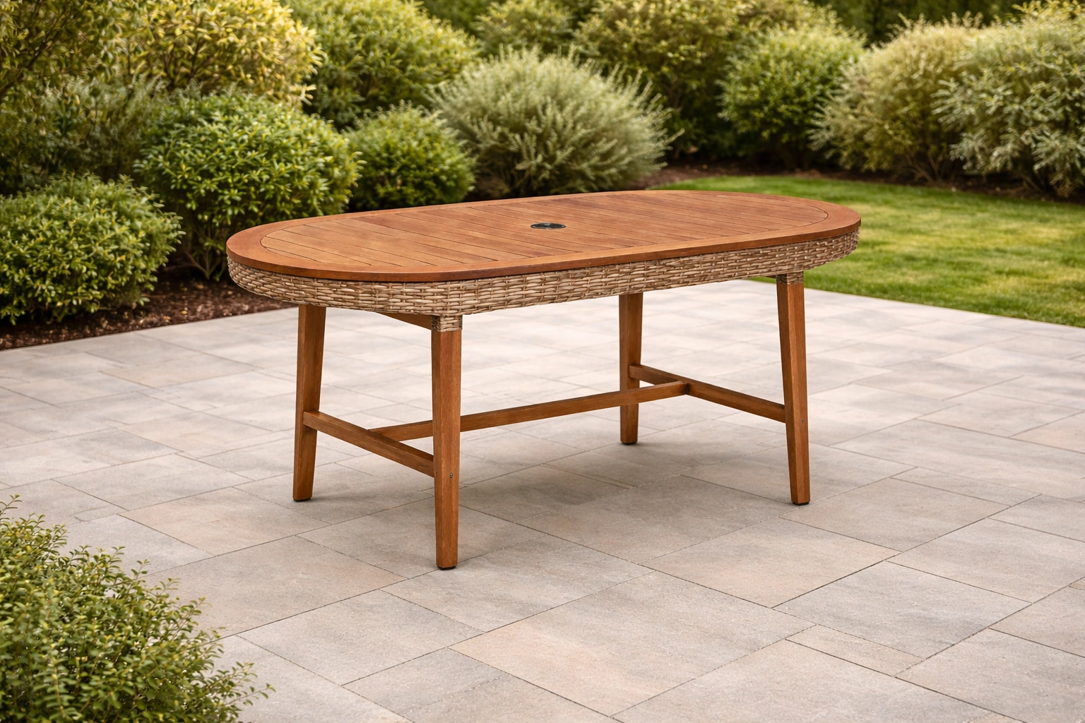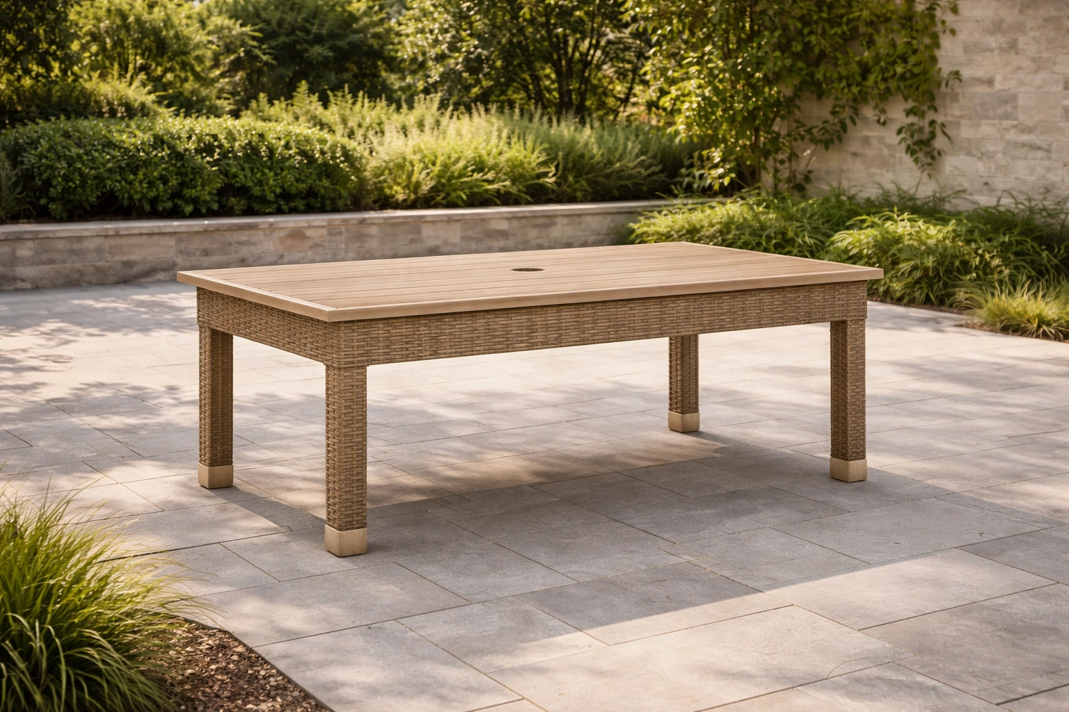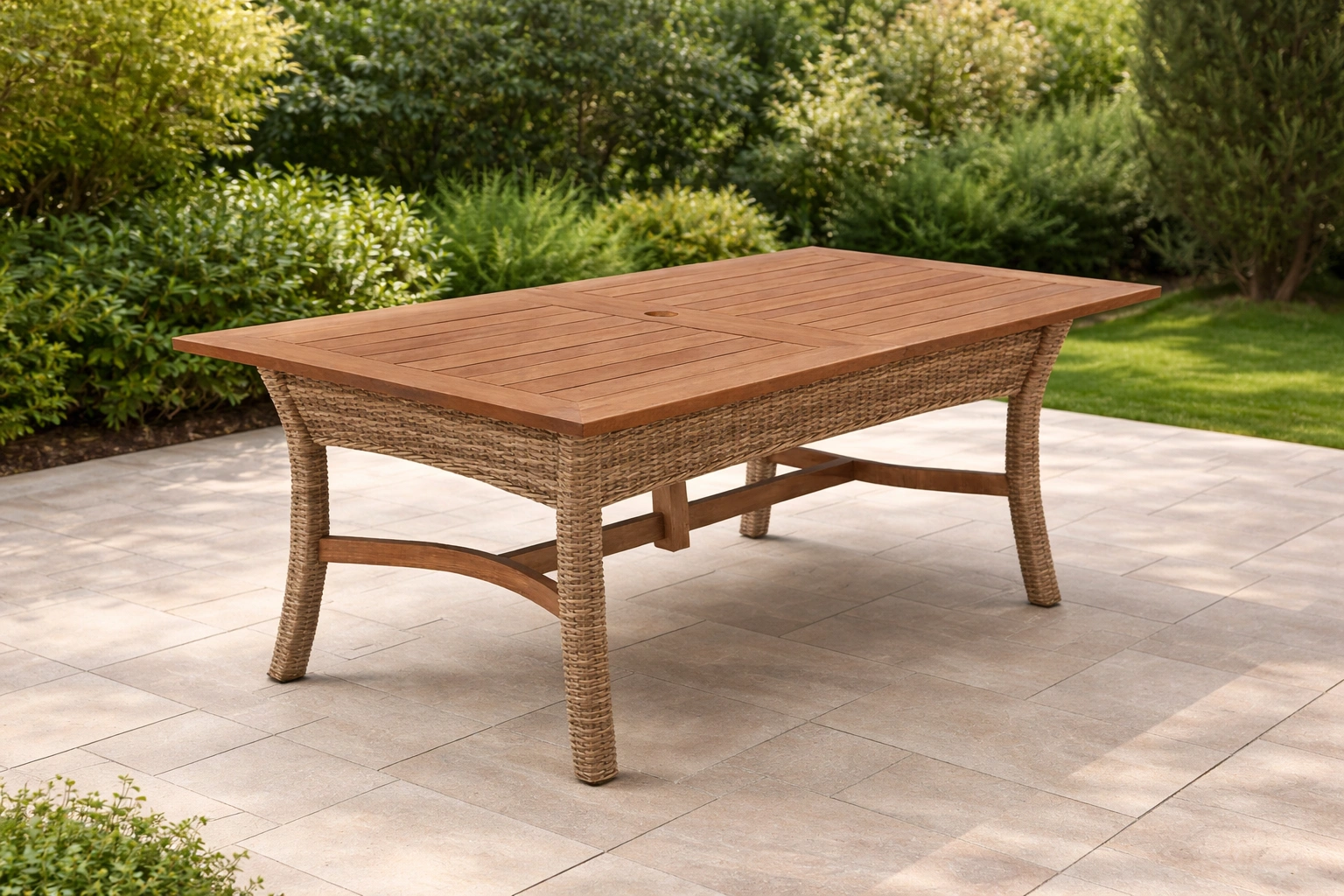 Table de jardin en bois et teck avec bordure en résine tressée
