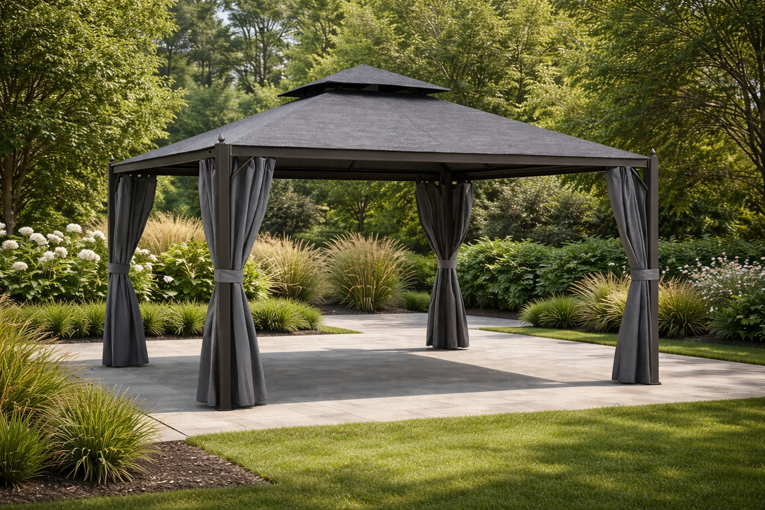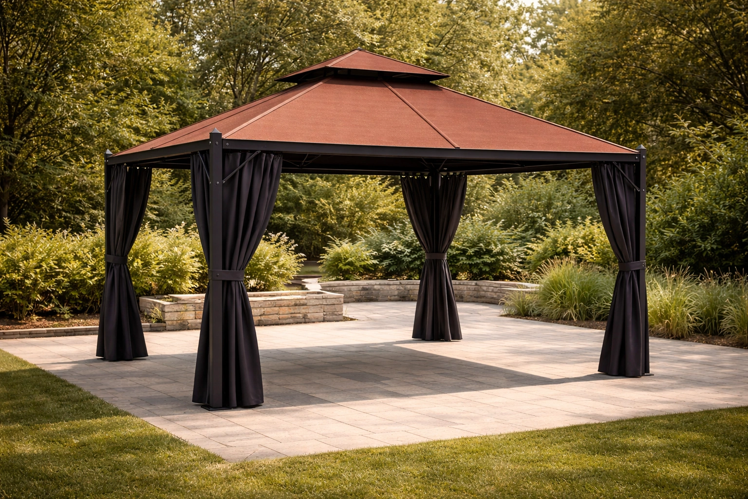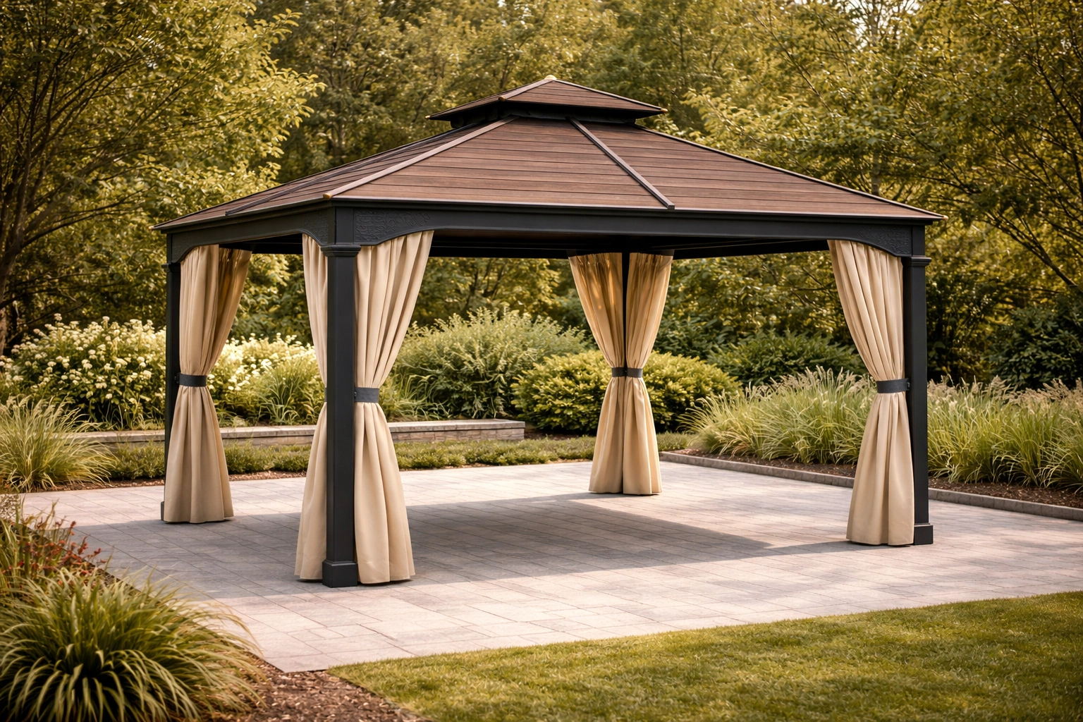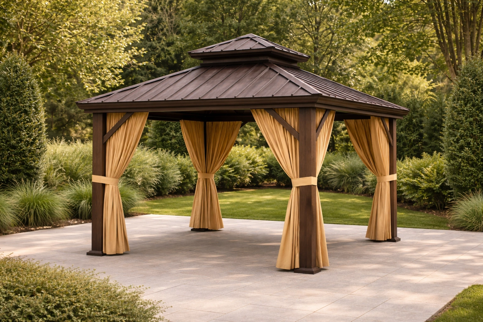 Tonnelle de jardin en aluminium avec toit en bois composite et rideaux en polyester