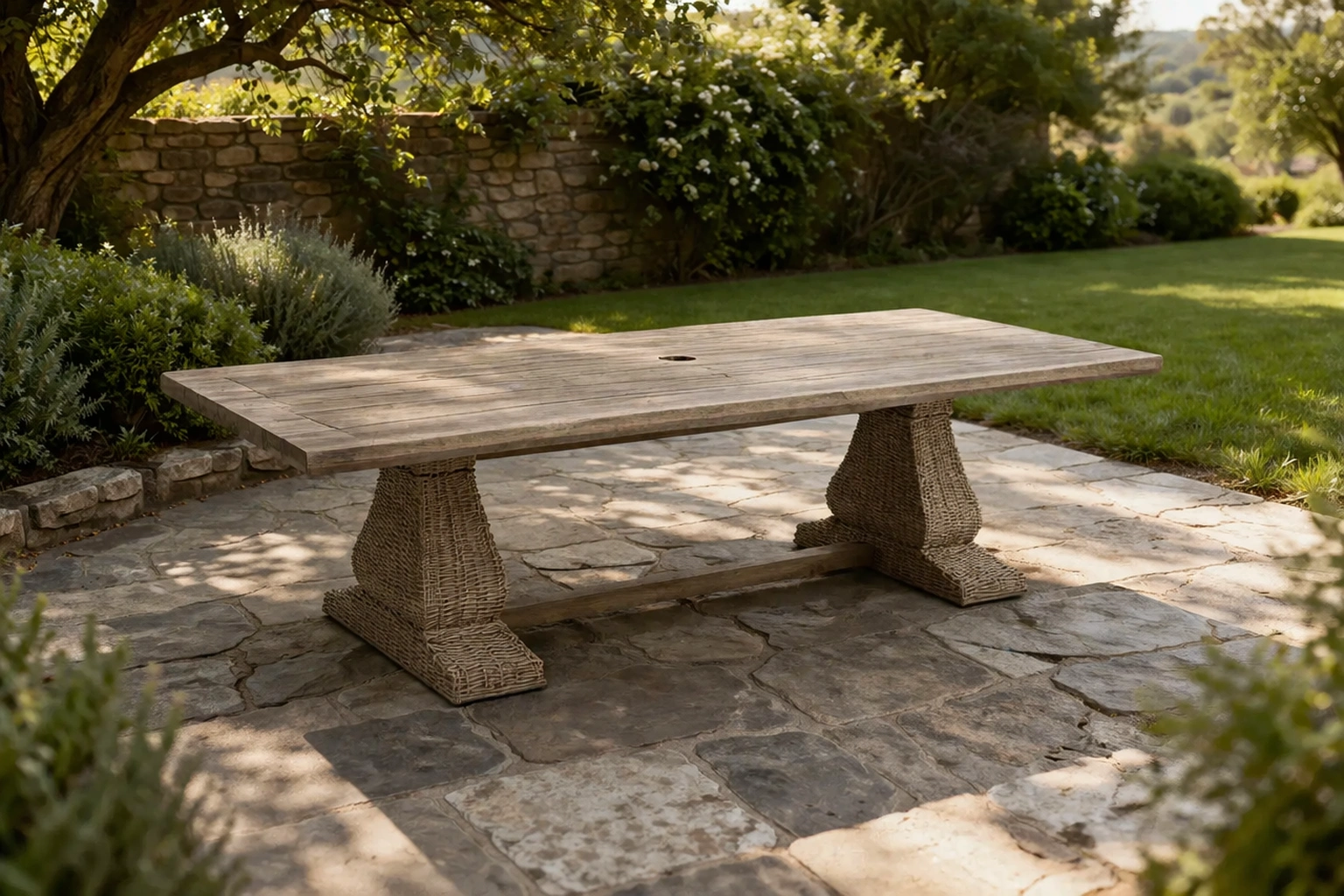 Table de jardin extérieure en bois et corde tressée