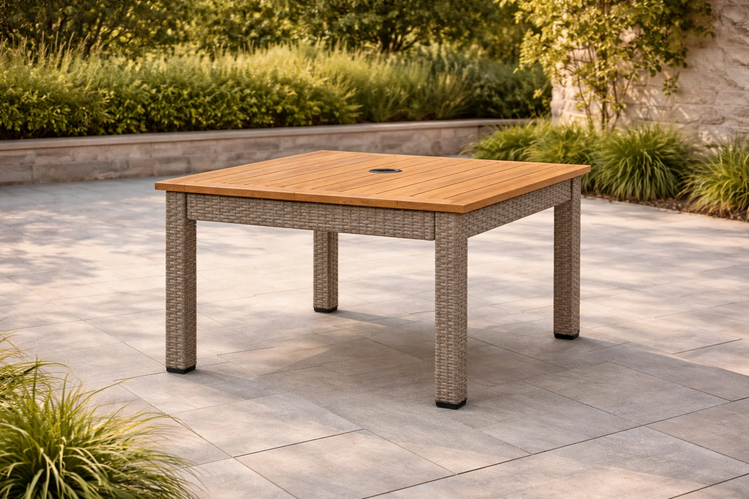Table de jardin carrée en bois et résine tressée