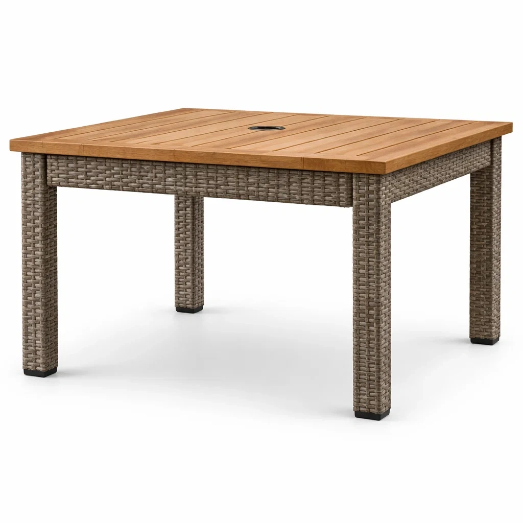 Table de jardin carrée en bois et résine tressée