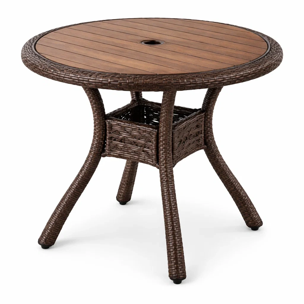 Table de jardin en résine tressée avec plateau en bois composite