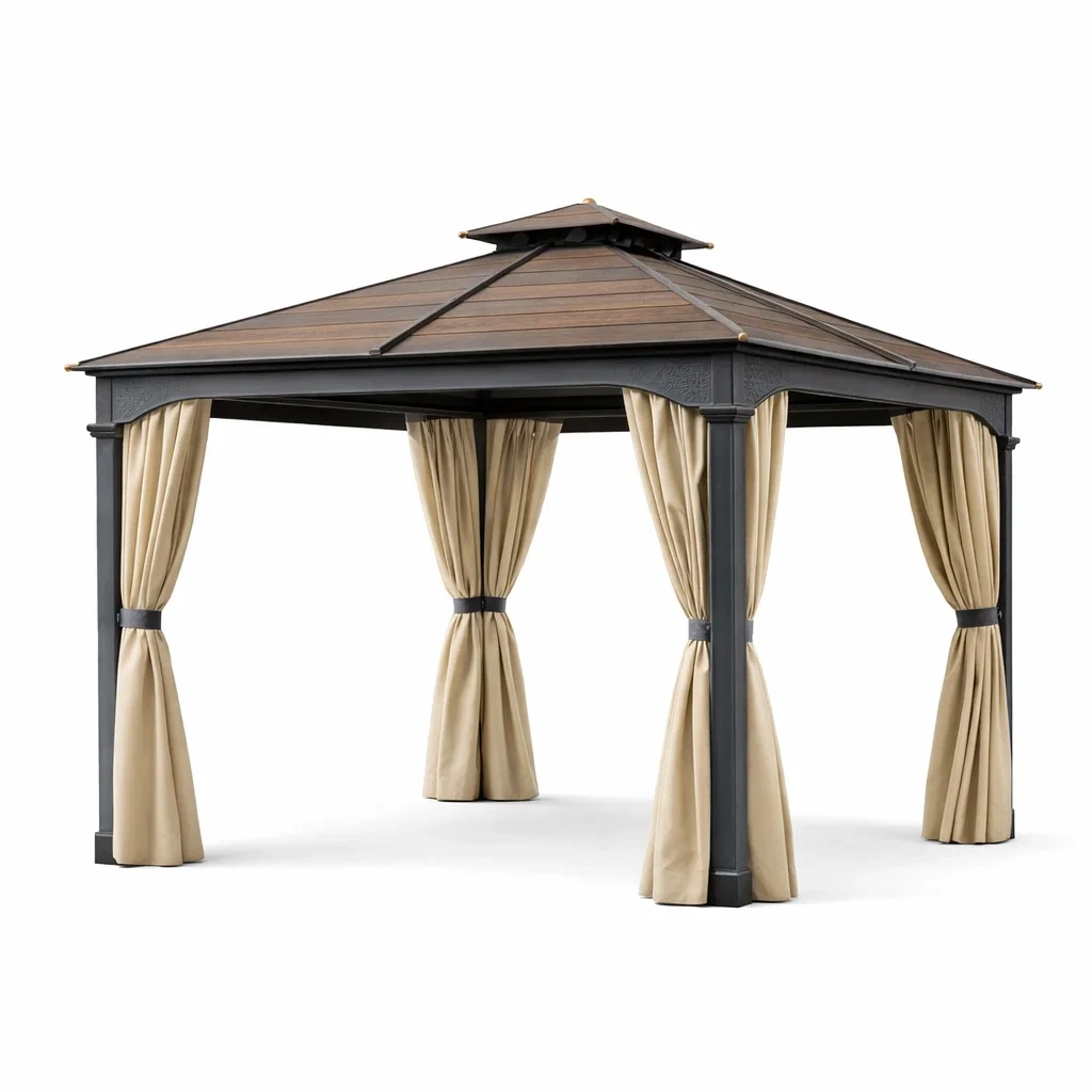 Structure en aluminium avec toit en bois composite. Rideaux en polyester beige.